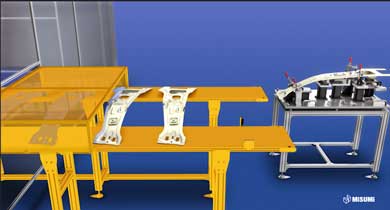 The gripper puts the flange plate first and then the B-pillar plate in the welding station in accordance with the assembly sequence.