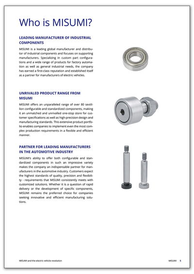 Suppliers like MISUMI are a driving factor behind this success. From providing precision components for batteries and powertrains to flexible configuration options tailored to manufacturers' specific requirements: MISUMI plays a key role in making electric vehicles more efficient, reliable and sustainable to produce.
