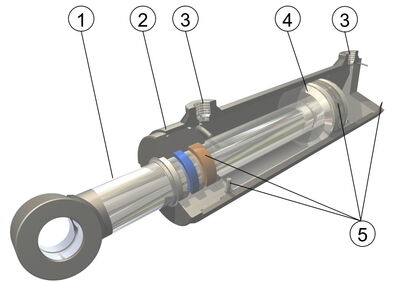 (1) Piston rod (2) Cylindrical housing (3) Connections (4) Piston (5) Sealing elements