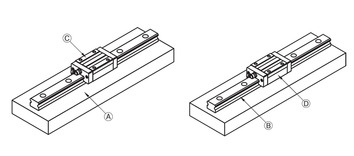 Right figure: relative deviation of reference surface D of the guide carriage against reference surface B of the rail |