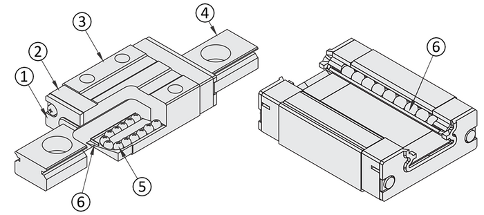 (1) Side seal, (2) Plastic recirculation unit, (3) Carriage, (4) Linear guide rail, (5) Ball, (6) Ball cage (wire)