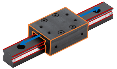 For plain bearing guides, the sliding surfaces are made of special materials, treated by a suitable coating and, if necessary, suitable lubricants are used to achieve the lowest possible sliding friction. It is also possible to embed a dry lubricant in the materials of the sliding guide, which enables grease-free and oil-free lubrication. This type of lubrication reduces the amount of dirt in the guide rail. The plain bearing bushing pushes adhering dirt particles off the guide rail. Compared to rolling bearings, plain bearings have a relatively large contact surface between the sliding body and the bearing surface, which makes them more resistant to external influences such as vibrations and shocks. In addition to very good vibration damping, they are often characterized by good emergency running properties.