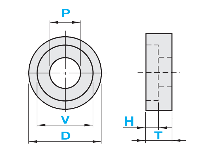Precision class | Dimension T: ±0.01 mm | Dimension T: ±0.01 mm Dimension H: ±0.1 mm Dimension V: 0.3 mm/0.1 mm Dimension D: 0/-0.2 mm Dimension P: 0.3 mm/0.1 mm |